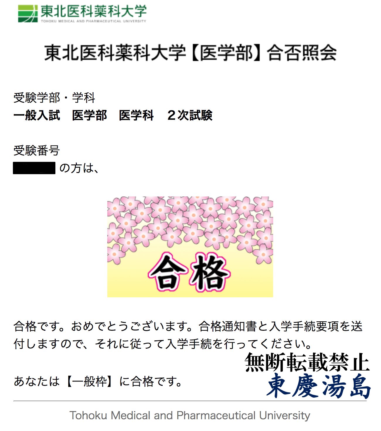 東北医科薬科大学医学部2次試験の合格発表がありました 2018 02 22 医学部 歯学部合格請負人のブログ