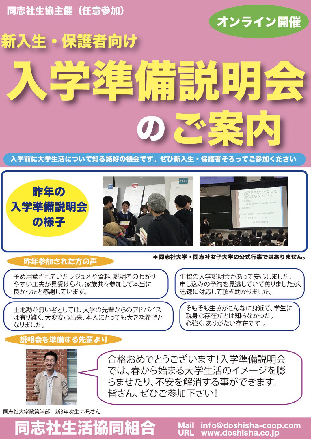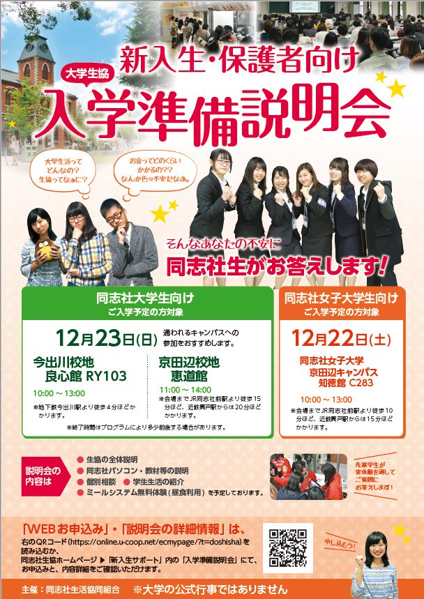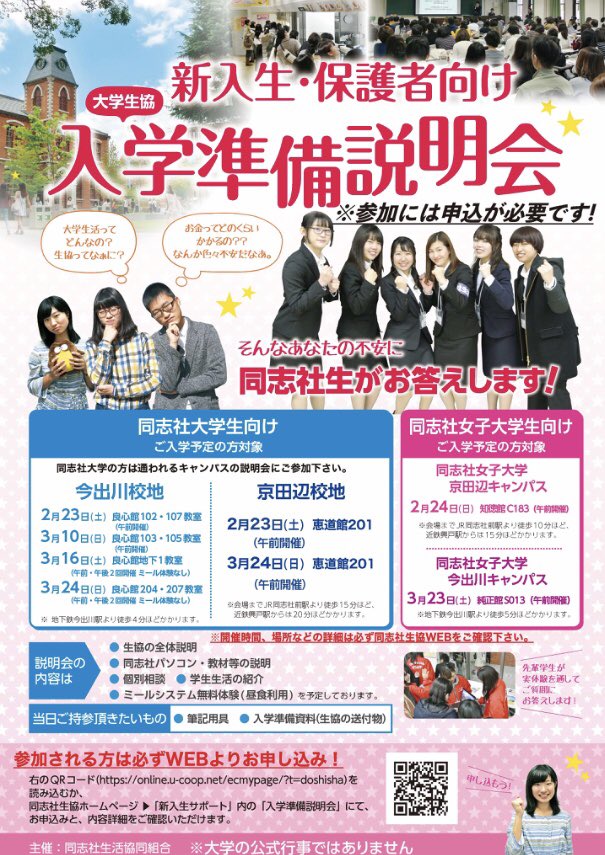 同志社生活協同組合 学生委員会 今出川 on twitter 入学準備説明会のお知らせ 同志社大学と同志社女子大学 の次年度新入生 保護者さん向けの 入学準備説明会 を開催します オンライン開催 予約制 参加を希望する方は1枚目の画像のqrコード or 同志社生協