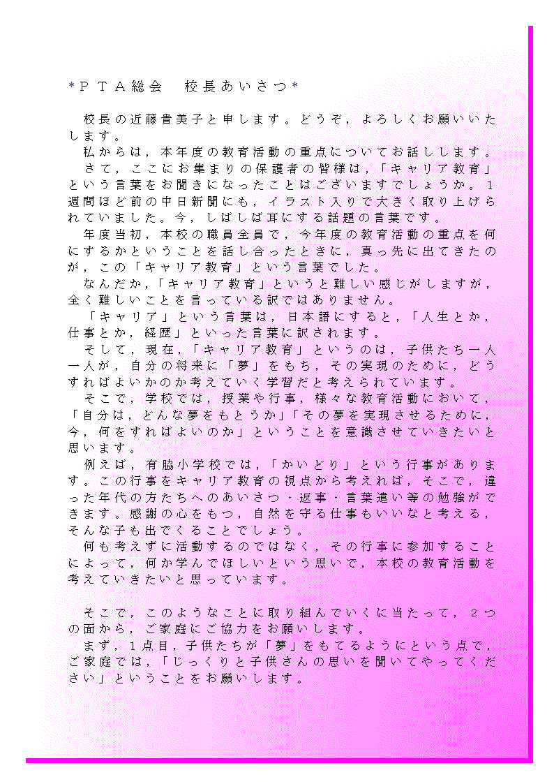入学説明会あいさつ 半田市立有脇小学校
