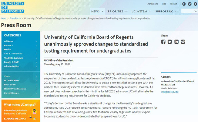 重磅 加州大学 uc 宣布 sat act不再是入学考试标准 美国新闻速递 us news express